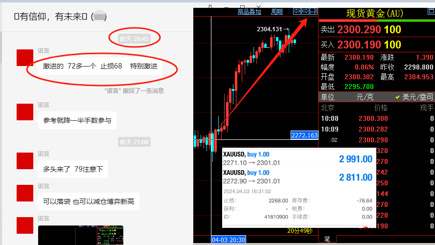 不出预料,昨天又来了一波35美元的上涨空间,黄金昨日最高来到2300一线,继续创下新高。日线继续报收阳线。昨日早间文章分享的2270-65区域多,结合实盘中给出的2268多和2272多,又一次成功预判的这波多头的起涨点,盘中继续收获多头利润。 今日还是维持顺势做多观点,绝不盲目和无端猜顶。早盘关注2298-96区域多做多机会,防守4,继续看新高跟着多头趋势。盘中策略线下实时更新。 本文客观理性的对后市走势做出方向性判断,文中操作建议仅为作者个人观点,且作者秉承“重势不重价”的交易原则,所以需要盘中实时调整点位, 内容仅代表作者观点,仅供学习交流,并不构成操作依据。如有需求可联系本文作