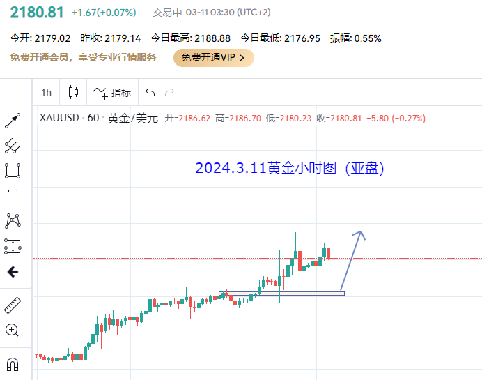 周二晚间 CPI 数据利空的一波下跌后,黄金昨日走出一波单边涨幅超过 20 美元涨行情。复盘来看,周二数据的利空成为这波黄金的蓄力调整,随着昨日黄金日线收阳,白银再出新高,黄金经过短暂的调整后,多头有继续发力上攻之势头。 昨日实盘中,欧盘时段给出的 2160 多单,短线收获在了 2170 上方,短线走出 10 美元空间。 昨日黄金拉升之来到 2180 区域后,经过短暂的修复调整,当前 4 小时, 1 小时级别多头走势依旧,早间短线做多位置关注 2172/73 支撑区域,防守 4 美金,上看 2185 区域。留意该区域是否突破或滞涨,决定是否执行回调单的介入。 本文客观理性的对后市走势做出方向