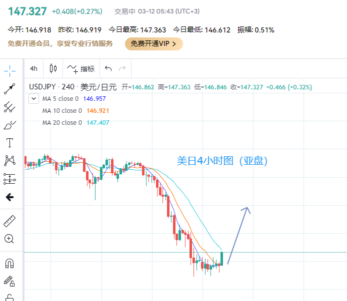 亚盘分享的美日 4 小时走势图如下: 昨日分享的美日上涨机会,盘中入场从 147.10 区域到 148.10 区域可以有 100 点以上利润。当前美日再次回 147.30 测支撑区域,如果多头继续延续, 147.30 这里将是不错的做多位置。继续上看 148.30 一线或者上方。 本文客观理性的对后市走势做出方向性判断,文中操作建议仅为作者个人观点,且作者秉承“重势不重价”的交易原则,所以需要盘中实时调整点位, 内容仅代表作者观点,仅供学习交流,并不构成操作依据。如有需求可联系本文作者。盘中交易策略欢迎添加实盘 V信:Br300899 QQ:1211945182