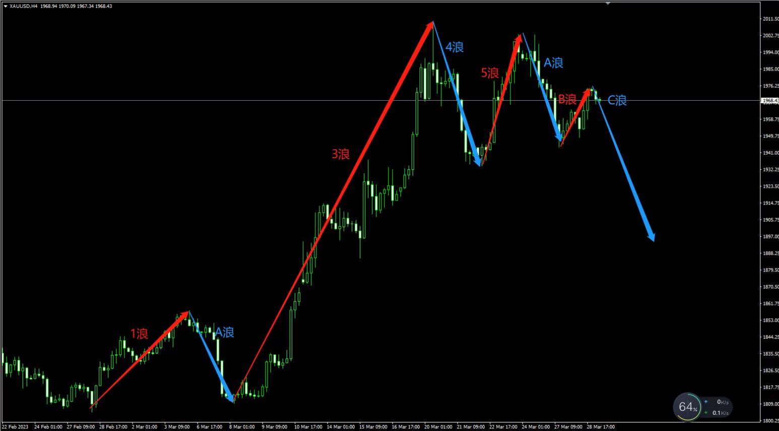 从日线上看,金价在高位运行,且呈高点不断降低,低点不断抬高的收敛姿态。这一姿态从四小时上看,很明显。本周以来的走势,是一个拉锯走势,属于混沌状态,从周一到现在的裸 K 上就可以看出来,阴阳交替。 我们昨天预判金价正在走 C 浪下跌,但是金价并没有下破昨天提到的关键支撑 1954 美元。那到底现在还是不是 C 浪下跌?其实从目前的价格运行上来看,只要 1975 不站上去,笔者就认为问题不大。因为如果站上 1975 ,它大概率要去收敛三角的上边檐,甚至不排除突破三角形后进一步上扬。所以, 1975 美元一线是一道关键的压力。 还有一种情况,就是昨天不是 C 浪的开始,到现在都是