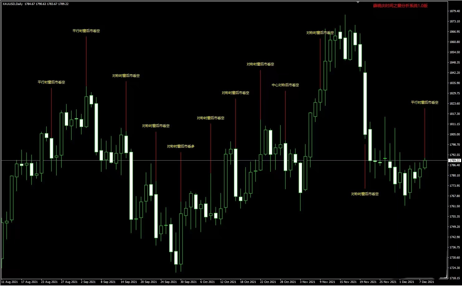月线上来看,金价在上根月 K 线之内孕育,不上不下。 1760 不能有效跌破,就无法打开下行空间。 周线上来看,金价处于自 1877 美元下跌以来的下跌结构中,只是目前处于弱势反弹阶段。如下图所示,相邻两个黄圈所示价格的差价是一致的,由于受到此前三根周 K 线下跌压力,所以虽然整体看空,但是如果金价无法跌破 1760 ,就还会延续盘整走势。 从日线上来看,金价走的形态并不好看,第六个交易日了,都维持着 “阴阳交替”的混沌走势。以 1877 为对称轴进行测算,金价这种阴阳交替的混沌走势即将结束。以外部对称和平行结构来测算,金价即将发生时间之窗变盘动作。今天是中国农历的大雪节气,按照
