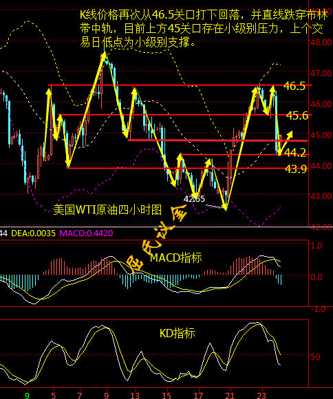 和什么样的人在一起,就会有什么样的人生。和勤奋的人在一起,你不会懒惰;和积极的人在一起,你不会消沉;与智者同行,你会不同凡响;与高人为伍,你能登上巅峰。 原油行情分析: 自原油EIA利多以来,加上冻产协议的消息面支撑油价,原油管道破裂,港口被占领,油轮无法出发等消息面进一步支撑油价,原油从四小时走势图来