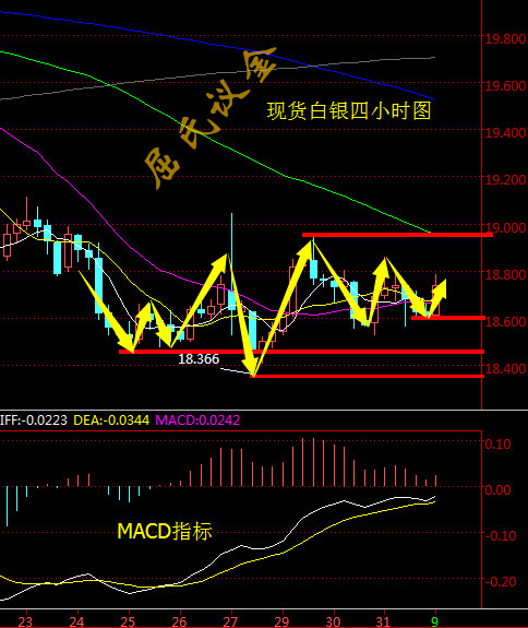 短线空头趋势明显,晚间美盘期间,美元指数可能会继续走强,油价可能会试探昨日低点44.7,目前油价在45.3美元附近震荡,操作策略依旧是回调做空,具体点位操作建议依然会在实盘中给出! 白银技术面分析: 技术面上看,日线级别上,隔夜银价在下探18.70美元水平后反弹,并录得锤子线。指标上,MACD红色动能柱收缩,双线接近