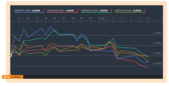 6月英国退欧公投后,外汇市场上表现较佳的亮点集中在英镑系货币上,尤其以英镑的交叉盘亮点较足,投机或者投资的投资者都能获得较佳的收益。以下图Bloomberg的镑系货币对比关联图看,自7月11日至今,镑系交叉盘中英镑兑澳元(GBPAUD)1个月的跌幅超过2%,近1000点跌幅;其余诸如英镑兑纽币(GBPNZD)、英镑兑日元(GBPJPY)