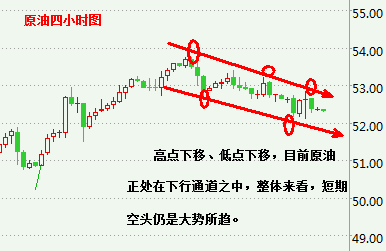 原油昨日再次收阴,昨日白盘行情再次低走,欧盘有所回升,总的来说晚间就是一个区间运行。今早API数据公布上周美国原油库存下降,,因此行情有所下挫。总体来看,原油行情仍是空头占优势。 实时分析: 从技术面四小时图上看出高点下移,低点下移短线油价也跌破了从47美元低位反弹上行的上升趋势线支撑,上行通道已经完全