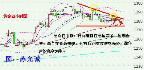 行情回顾: 黄金周一探高回落收低,亚市早盘跳空高开刷新1295.50高位,不过多头延续性不强,虚破周图趋势线阻力收盘之下。欧盘回调后,美盘反抽1292.40高点二次承压,探高不破。尾盘震荡回落并且跌破了1283的支撑,打破小时图台阶强势上升格局。 消息面解读: 昨日黄金期货价格高开之后随即走低。行情走高主要还是因为地