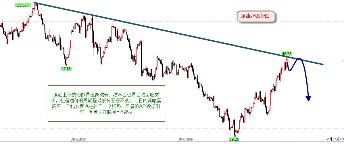 阿东说金:原油能否突破45美元一大关口?现货原油空单解套 你的头脑决定了你的选择,你的选择决定了你的收益。 昨日EIA数据出现,超卖区促进了油价在一度的冲击43.36美元一线关口,原油筑底回升也是需要技术面的回撤;当然笔者阿东昨日文章里面就强调过原油的周期是以低位反弹多单为主,即使上行遇阻,那起码也要等到上方4