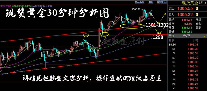 从30分钟技术图形上来看,现货黄金在上周五强势上破上升通道上轨压力1299美元,基本确认了涨势;早盘金价测试高点1304.5不破回落,至1300-1301美元,也就是上升通道上轨再次测试支撑,欧盘上行出现新高1305.7美元,多头上行的意愿还是相当的强烈的,技术走势也验证了当下多头的趋势,所以就操作上回踩做多为主,这个是