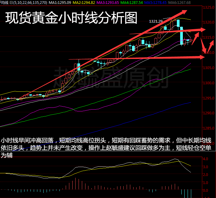 (北京时间1月11号赵毓盛/撰)周三的现货黄金走势可谓相当刺激,早间开盘于1312一线,亚盘盘初黄金震荡走低,盘中低点触及1308一线,随后亚盘及欧盘盘初金价维持1308-1312区间内震荡运行。欧盘盘强势暴涨,上方一度触及1327.6一线,强势多头的行情下顺势操作总是最明智的,赵毓盛实盘于1320一线追多成功于1326一线获利出局。