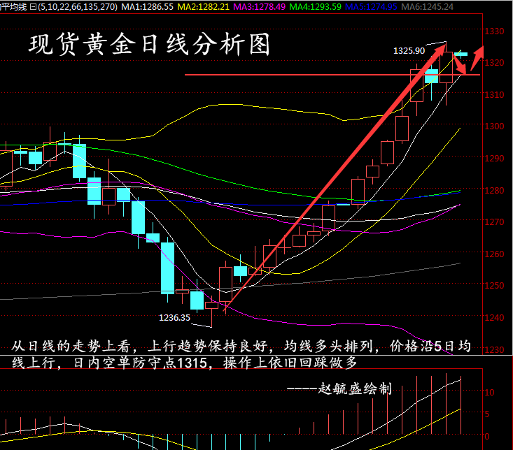 (北京时间1月3日赵毓盛撰)现货黄金隔夜再次上行冲高,并创造出了新的高点,最高触及1326美元一线,周四早晨对于周三的延续性的下跌测试并没能改变多头强势的趋势,在昨晚冲高之后收阳,大周期上此轮的下跌也只是单阴回踩,而并不足以对于前期强势多头造成大的威胁,在回踩蓄势之后,多空再次轮换,多头发力;对于此次的涨