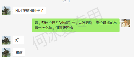 当巨大的亏损带来的后果的就是亏怕了,然后自己缺失对市场的信息,心态改变。不敢下单,做单犹豫,赚了就跑,亏了死扛,亏点就难受。大多数的投资朋友都有一个心态,越是亏损越是想回本。回本的最大希望变寄托在行情上,尤其是大行情。 昨晚原油EIA又来临,冰夏带领客户成功盈利60点以上,具体可以看冰夏写原油的文章。不过