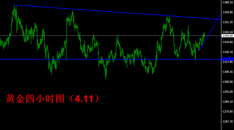 黄金交易策略实时分享,以分析求生存,以盈利求发展。 黄金交易投资要领: 顺势为皇,轻仓为王,点位为相,止损至圣,稳健收益,落袋为安,贪心必败! 黄金四小时图(4.11) 黄金昨日亚欧盘震荡回调1332,美盘创新高1340,后再次回调1336。夜间受受叙利亚事件影响,黄金再次拉升。夜间触及1342一线,收盘1339,日线连续三日