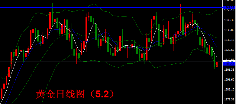 感谢关注头条号:宗现国 黄金交易策略实时分享,以分析求生存,以盈利求发展。 黄金交易投资要领: 顺势为皇,轻仓为王,点位为相,止损至圣,稳健收益,落袋为安,贪心必败! 黄金日线图(5.2) 黄金自1355一线展开回撤,当连阴形成后,我们就坚定看空。经过十个交易日的震荡下行,昨夜到达我们的目标位1307,最低1302一线