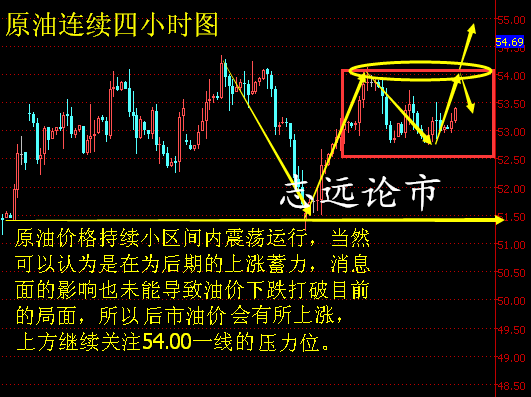 早间原油价格持续宽幅震荡运作,目前下方最低触及到52.95一线的位置,相差0.15个点达到我们多单进场点位早间在空间朋友圈也有提示过,加了我空间朋友圈的投资朋友都知道,价格最高也是触及到上方53.30,技术面四小时图上价格运作在BOLL中下轨之间的位置,上方依旧持续在BOLL中轨一线的位置受阻,迟迟不能打破,MA5持续交叉