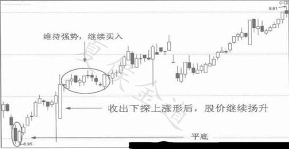 下探上涨型———— 下探上涨形形态一般出现在上涨途中,是由若干K线组成,在涨势中,某天价格或指数突然大幅低开,但当天多头强势,价格或指数一路上行,收出一根大阳线,甚至有涨停板收盘,之后依旧延续之前的上涨行情。下探上涨形是一个强烈的做多信号,特别是在股价或指数刚刚启动时出现。 形态要点: 1、下探上涨形出现在上涨趋势中; 2、中间某天收出低开高走的大阳线或中阳线,且低开的幅度一般较大; 操作策略: 在探明了底部区域,开始震荡上升时出现下探上涨形形态,预示着后市还会大涨,可以顺势加仓;在明显的上涨趋势的调整末期出现了下探上涨形形态,应及时加仓跟进;在相对高位出现下探上涨形形态,只能短线参与,并要