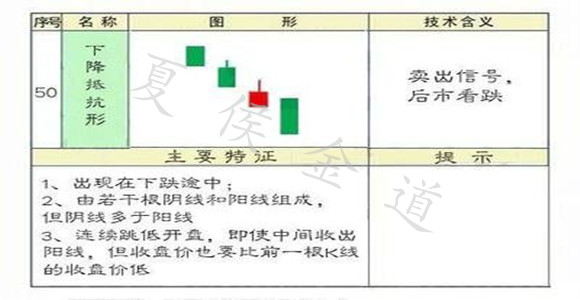K线图常见形态栏目专门针对K线的形态展开全面的分析,涵盖了K线图中经常出现的形态。通过对K线图常见形态的学习,在K线图技术分析中起到关键的作用,对投资者来说是必须掌握的知识点。 下降抵抗形形态简介: 下降抵抗形一般出现在下跌行情途中,是由若干K线组成,价格或指数连续跳空低开,并收出众多阴线,其中夹着少量阳线,但这些阳线的收盘价也比前一根K线的收盘价低。下降抵抗形反映多方不甘心束手就擒,不时的组织反抗,但终因大势所趋无力回天。 形态要点: 1、K线图中连续出现跳空低开的阴线; 2、在K线图中夹杂着阳线,但阳线的收盘价依旧比前一根K线的收盘价低; 操作策略: 在经过长期的大幅上涨之后出现了下降抵