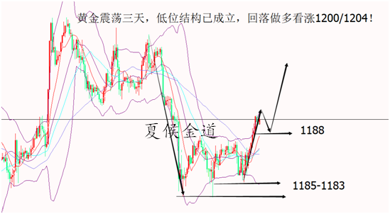 在时间拽着你缅怀过去之前,学着欣赏现在所拥有的。真正懂得生活的人,绝不会拿往昔来填充现在。无论过去发生过什么,你要相信,最好的尚未到来。交易中若有勇气说再见,市场也会还我们一个崭新的开始。美好的,留在心底;遗憾的,随风散去。 可以说是寂静了三天的行情,周一至周三黄金一直保持在1192-1185区间,没有实质性的走出破位或者结构出来,总体多空方向也不是很明确,夏侯也是一直在1183-1195区间操作接连获利。周三午夜一波破位了1192前期一直的压制,最高在1195一线,成功到达夏侯预测的1196的压制点,这一波基本确定了黄金在本周起可以延续上涨的基础,上方还可以到12000/1204/1208
