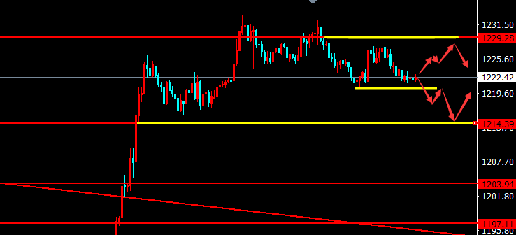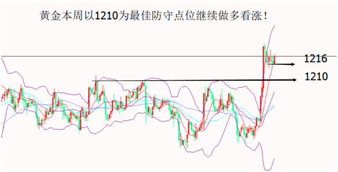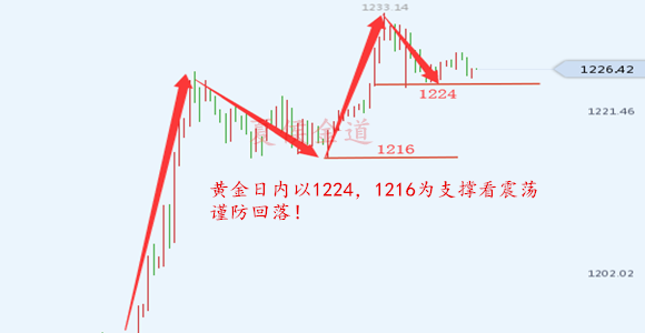 投资市场是一个历练人性的地方,恐惧和贪婪是世界公认的人性弱点!除了修仙成佛无人能摆脱,上钩的鱼若不是贪婪则不会成为盘中餐,癌症患者若能摆脱恐惧多活几年的概率很高,而交易市场既然无法摆脱贪婪和恐惧,那就要用交易规则去避免或者说是把贪婪与恐惧的力量降到最低,摸索则是交易中最大的成本!少走弯路,少掉坑的最大接近就是跟随具备经验和教训的人一同前行! 黄金上周周四出现大涨行情,单日走出34美金的大空间,直接一波到顶部1226一线,这种行情是目前今年单日最大的涨幅,也是今天一波拉开区间的最有力量的单边,而且上周五在震荡周期中没有较大回落,也说明了黄金短期内表现的非常强势,因此,留给本周额度黄金行情肯定是