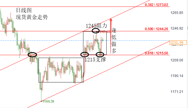 本周市场聚焦明日美国中期选举,暂时交投比较谨慎,夏侯认为此消息面将对黄金价格形成利好影响,市场调查新闻显示美国总统特朗普在中期选举前的支持率不高,市场避险仍然浓厚,一旦美元抛盘走跌,金价将有望再次走出新高,大趋势上笔者夏侯金道倾向于继续逢低做多黄金。另外需要说明的是,此次选举侧重点应该是党派之争,而特朗普继续当选可能性极大。 技术面上看,日线图连续大阳K拉升建立反弹格局,上周金价一度回调至0.618黄金分割线1215美元附近,然后快速上调回到高位,个夏侯人预计空头正在抛售,剩余的将是看涨或者观望投资者,在多头推动下,后市黄金看涨前景很大,明日美国中期选举将是机会。日内重点关注上方1237的阻