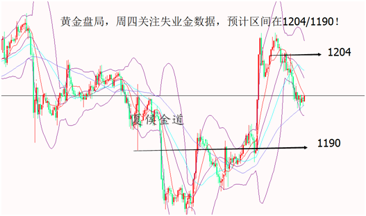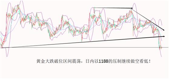 成功不可能是急功近利的模仿,梦想更不可能是人云亦云的跟随。在交易中,真正能有所收获的人,都有着对错误的不断总结、对目标的坚定持有,相信自己的判断,却又并不固执,只有如此,才能在日复一日的盘面中找到正确的路。 周四黄金终于走出了破位的行情,黄金在1198的高点,最低在1181一线,直接跌出了17美金,一个交易的时间比本周前三天的行情都大,就怕没有行情,行情来了就有意思。今天周五,日线,周线,月线收盘,周五必有一波行情,预计今天黄金先跌后涨,也有扫盘的可能。按照技术面来看,黄金破位1193以来,日线两跟阴线拉开布林带,这一波跌也就刚刚开始,今日日线连阴,这一波黄金可能在下方看到1173/1160
