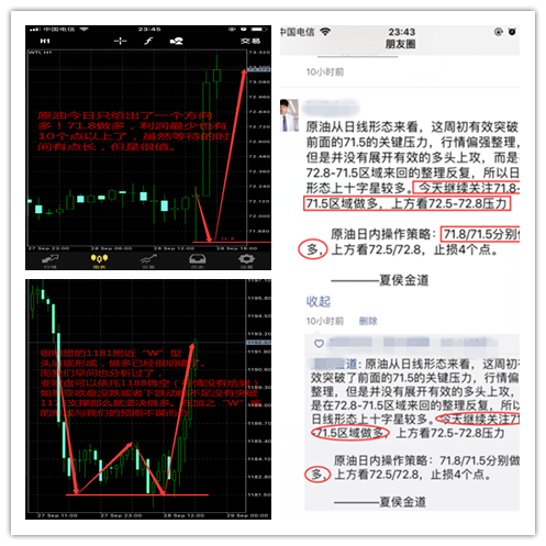 很明显的1181附近“W”型头肩底形成,做多已经很明确了。而我们早间也分析过了,亚欧盘可以依托1188做空(行情没有给到)如果亚欧盘没跌或者下跌动能不足没有突破1173支撑那么就坚决做多。在加之“W”底的形成与我们的预期不谋而合。而原油今天只给出一个方向,那就是多!已经很明确了,71.8做多,利润怎么说也有十个点了吧,虽然等待的时间有点长,但我和我的投资朋友都觉得很值,不是吗?欢迎大家在夏侯朋友圈查看验证 所谓套单不可怕,心态最尴尬。本想用一赚十,结果却用十来添了一,家财散尽,伤痕累累,最初的梦想如今成了泡影。所以,你放弃了吗?在一败涂地的时候,你何曾想过原因,为什么你和别人是相反结果?投资