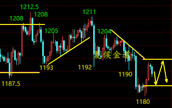 昨天国庆刚刚收假,同时也是寒露节气,昨天黄金空头就给大家来了个下马威。金价自早盘开盘后就持续下跌,至美盘再度大幅下挫,最低见1182上方,日内整体跌幅达到21美金,虽然尾盘小幅震荡反抽,但日线依旧以大阴报收。 从盘面上看,黄金昨天继续收阴,但好在止步于1180以上,依旧处于震荡区间内部,多头依旧存在一线生机。现在是多头能否守住1180一线的防守位,以及能不能强势收回昨天美盘开跌位置1195。黄金若是能够收回1195上方位置,多头还有的看,否则震荡修正的行情还将继续延长。 综合来看,昨天黄金虽然大幅回落,盘面一度表现出弱势行情,但是夏侯认为黄金整体上依旧维持在震荡区间内,日内短线上重点还是先关