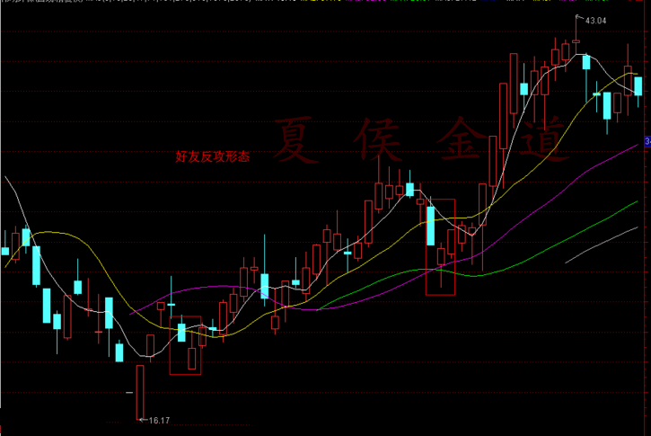 形态简介: 淡友反攻形态与好友反攻形成相反,是由一阳一阴两根K线组成,价格或指数先是走出一根大阳线,接着跳空高开,但最终是以一根大阴线或中阴线收盘,并且收盘价格与前一根阳线的收盘价接近或相同。 形态要点: 1、淡友反攻由前阳后阴两根K线组成; 2、第二根阴线为高开低走的中阴线或大阴线; 3、两根K线的收盘价格相