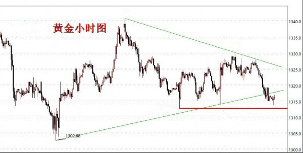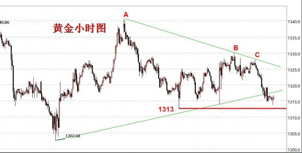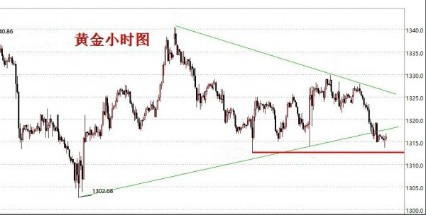 黄金快要破位了,前面周初两天一直在测试支撑,最终通过周二美盘下探1313.7回升确认支撑后当场大涨,记得很清楚,因为当时1318多单在手,然后美盘数据下探过程中1316加仓多,虽然最终是大涨起来了,但不得不说当时是承受了很大的压力,有这压力所以记忆犹新,之后周三周四行情多次遇阻1328-30区域,导致昨天行情一直走弱,美