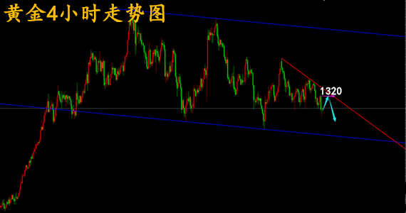 黄金晚间将会是议息会议,所以这之前破前期的低点1302区域预计可能性不大,也就是早间操作上还是要保持反弹逢高做空的节奏,但是在千三关口,做单要及时获利,谨防触底反弹的走势;从4小时图来看,黄金运行在大区间1307到1322区间内部震荡,从当前的K线来看,K线的实体在不断的放大,空头力量在加强,但是并不改变黄金在区间