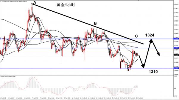 目前,金价处于5日均线的下方,短期上方除了1320的压力之外,另一个则是在1324的点,而支撑的区域在1310,今天将于1310-1324的区域之内保持着震荡,而1316处于中间不上不下的位置,亚欧盘我的建议还是多看少动。 如图,今天将于1310-1324的区域之内来操作,上方触及到1324的高点位置再去空,而下方则是在1310的支撑位置再多