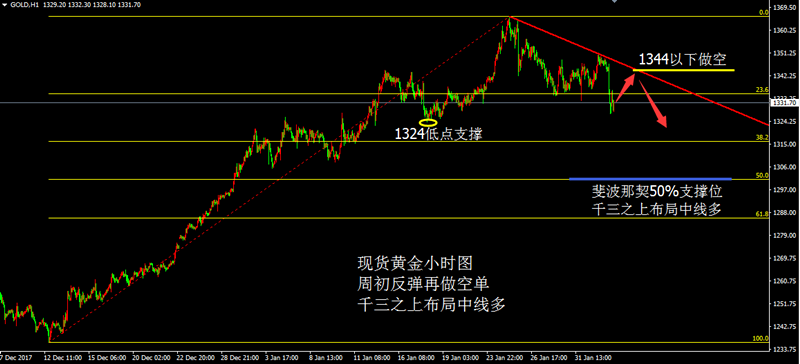 时光荏冉,岁月如歌,记忆似乎停留在过去的时光,青春和朝气又一次来临,儿时的伙伴与年味已经悄然不在,但却依旧每年回家陪伴家人。爱不是一种誓言,而是陪伴。2017转眼已经不在,2018早又来临,新的一年希望所有的朋友一切安好。 黄金从日线级别上分析来看,金价还是难以逃脱大区间震荡格局,目前金价触及布林下轨后开始反