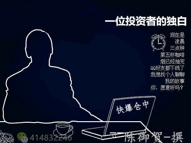 陈御贺:做投资换平台换老师还是亏?帮你算一笔触目惊心的账! 做了好多年分析师,也是看多了好多人的实例,有人欢喜有人愁,我想了很多总觉得必须写下来,没有更多的是想帮到别人,是想有一天自己看到,能提醒自己不忘初心!这一行,接触过什么都不懂的投资新手,接触过行家,接触过骗子,接触过同行。就在想这么多的人最