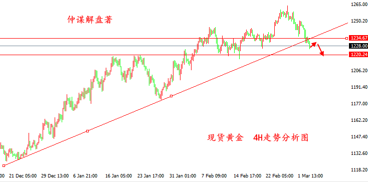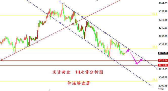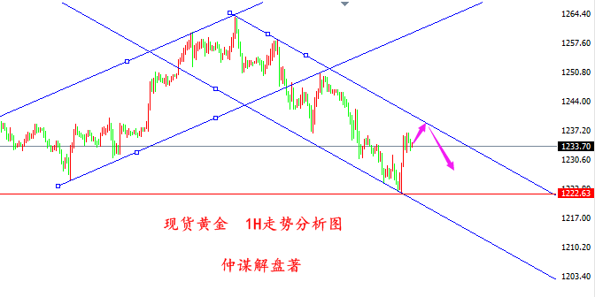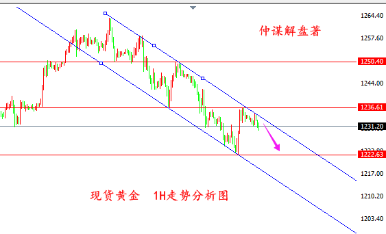 走了一天,金价自1237一线走了回落,本以为金价会延续周六凌晨的反弹,继续向上的,没想到1237只是虚晃一枪,看来下降趋势线压制还是很给力的。 欧盘,金价延续走弱,最低触及1230一线,至少目前来看,美盘肯定是强不了,1240-1242区域可能要在等等。小时线三连阴,且白盘大部分收阴,典型的属于阴跌下行,早间在1231/32布