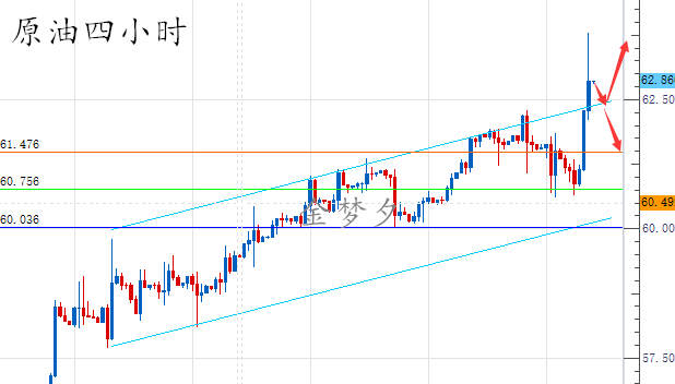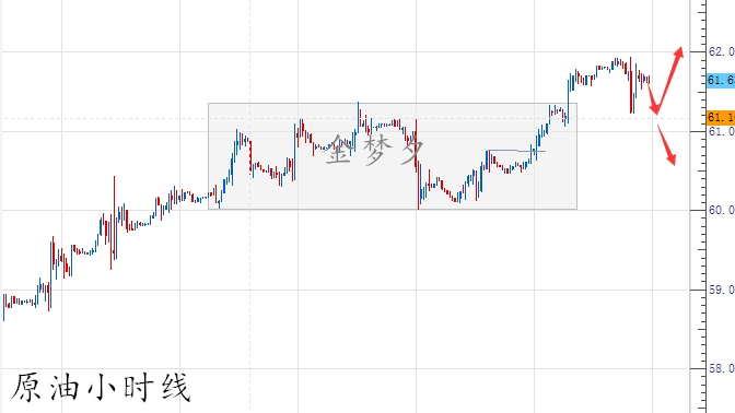 文金梦夕 市场里,都是没有安全感的博弈,因为太在意,所以都害怕失去机会,一个人彻悟的程度,恰等于他所受痛苦的深度。以人为鉴可以知得失,以史为鉴可以知兴替,逆风的方向更适合飞翔,不怕千万人阻挡只怕自己投降,任何的博弈命运如同手中的掌纹,无论多曲折,终掌握在自己手中。 本周以来油价测试了62.3的高点后快速回落,一度跌至60关口附近,但是我们看到后续动能不足,多空双方在这个区域形成拉锯。当然小周期上你可能很难看出谁站上风,但是从日线级别来看,周一的高位十字星已经很能说明问题了,不管从强弱、时间周期、还是相对位置上来说,这里形成阶段性顶部,走出一波像样的回调是大概率要发生的了。结合小时图走势,日内