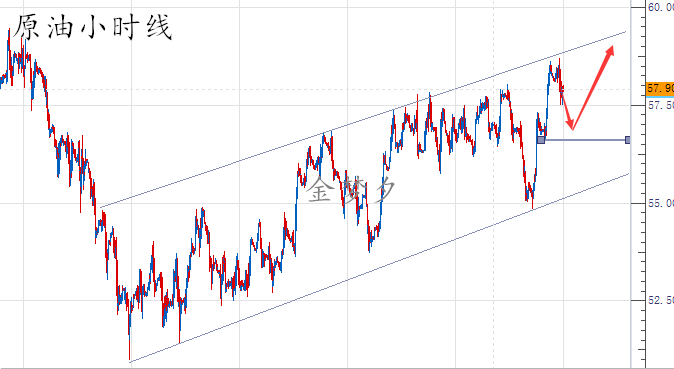 文/金梦夕 财富的累积初级阶段需要胆量和勇气,而中期阶段需要排兵布阵,后期才能享受被动收入。交易之中,盈利的积累初级阶段需要极度相信,而中期需要点兵试错,后期才能练就火眼金睛。 原油破位上涨,EIA数据利金助长油价进一步上涨到达57上方,周四周五延续涨势最高到达58.7一线,收于57.8,周线收长下影线,从周线看布林轨平行微收口,本周重点关注59.5一线能否上破,如能上破则有望上冲60上方,反则油价将是新一轮的下跌,因此,操作上即便不乏博空的行为,但主要还是以回调接多为主,直到周二的这波回调,可以说彻底打乱了思路。虽然周二的空单利润梦夕全部抓住,可周尾盘看遇阻回落均以失败告终,总体来说并不理
