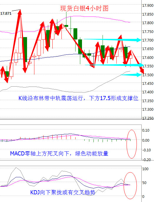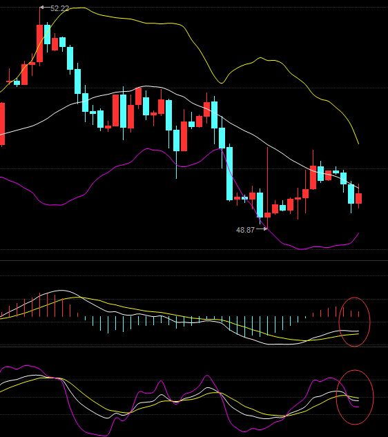 最近原油的行情可谓跌宕起伏,从日线看,原油收取三连阴后喜迎小阳柱,MA5下穿MA10形成死叉,MA5、MA20下方50.03美元形成一线压制,均线系统呈空头发散运行。从四小时看,K线运行于所有均线系统下方,MA5于MA10有形成死叉之势,空头趋势比较明显;布林系统开始走缓,K线下破中上轨,目前运行于中下轨,中轨49.50美元由支撑