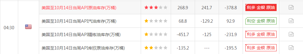 原油暴涨原因解析: 原因1:API原油库存大减378.8万桶 目前市场静待美国上周库存报告。北京时间周三凌晨,美国石油协会(API)公布的数据显示,截至10月14日当周,美国API原油库存大减378.8万桶,此前预期增加241.7万桶,前值为增加268.9万桶。API原油库存数据公布后,美油布油双双上涨,美油涨逾1.5%,布油突破52美元/桶。