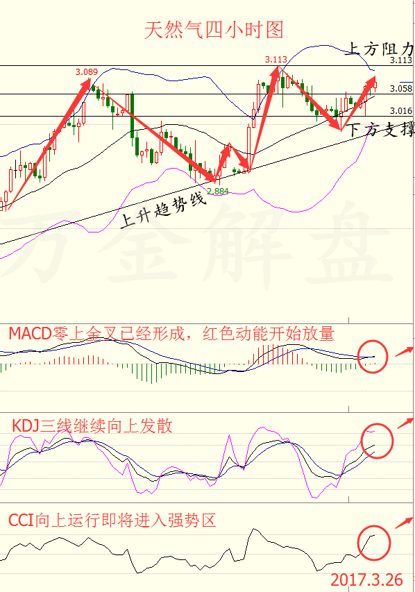 天然气技术分析: 回顾昨日行情,亚盘时段及欧盘时段行情震荡下行,直到美盘时段行情受到日线级别MA10均线支撑,触底反弹,跟上昨日万金操作策略的朋友相信都是小有斩获,而跟上实盘指导的更是获利不菲。 从日线级别来看,K线价格位于布林带上轨通道,沿着上轨运行,布林带向上运行,均线系统呈现多头排列。MACD快慢线向上