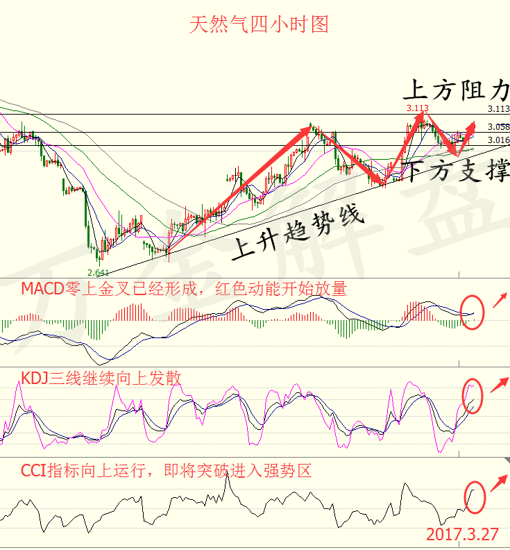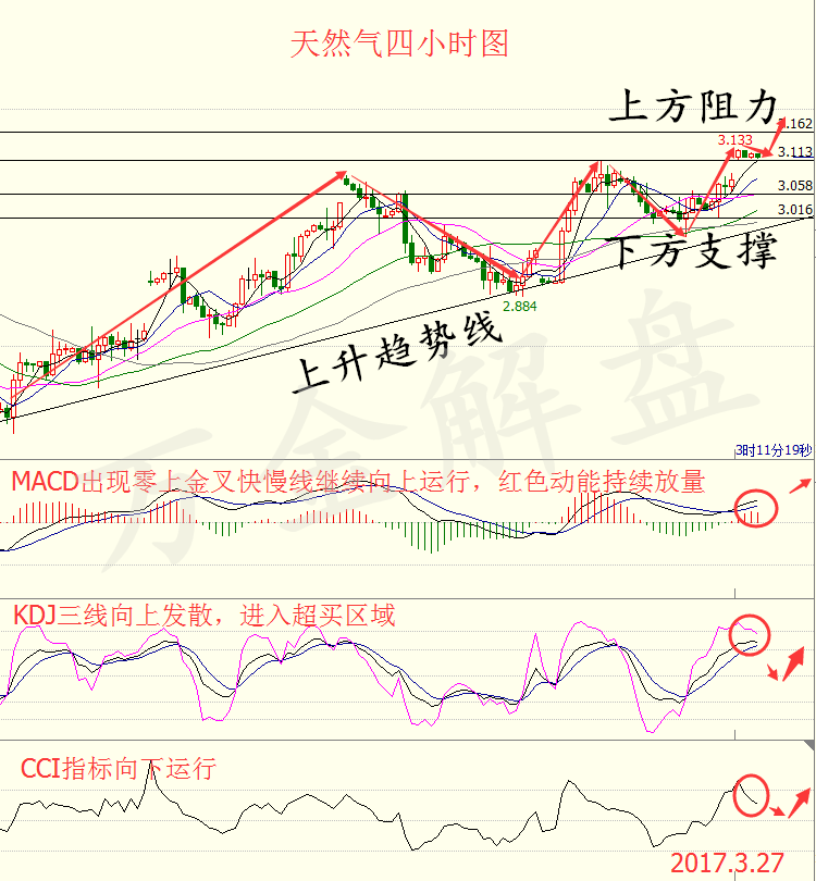 你的投资我帮忙,你的梦想我起航,如果你和行情做斗争,趋势看错被深套。如果你一入行情深似海,赔了夫人又折兵。投资就像人生,没有那么多如果,只要思想不滑坡,办法总会比困难多的关注笔者万金解盘,获取每日资讯,行情分析。探讨交流投资之道,我们一起赢之有道。 天然气技术分析: 回顾日内行情走势,早间行情高开