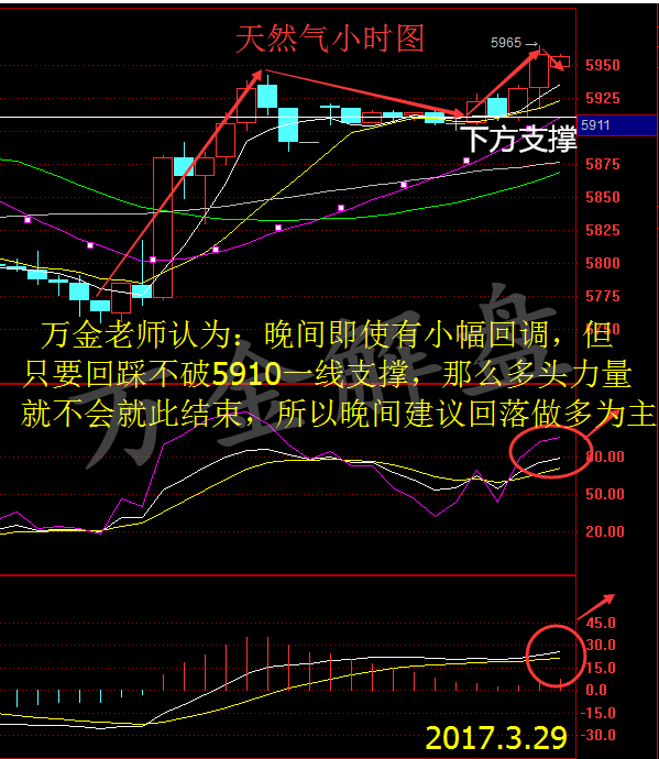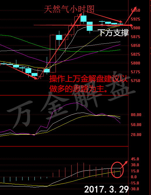 市场是绞肉机,也是提款机,关键在于操作者的个人修养以及交易水平。一切福田,不离方寸。输赢与否,最终还是要落到操作者个人身上。 天然气技术分析: 回顾昨日行情,亚盘时段震荡整理,欧盘时段行情开始向上突破,虽有小幅回落,但整体趋势没有变化,多头强势。美盘时段,行情继续向上突破,至午夜时分终于是来到万金老师