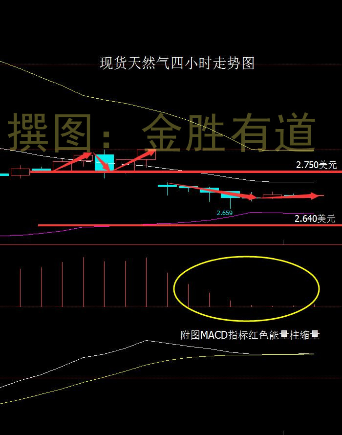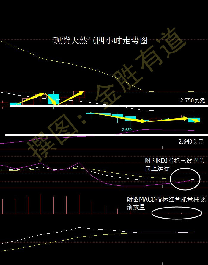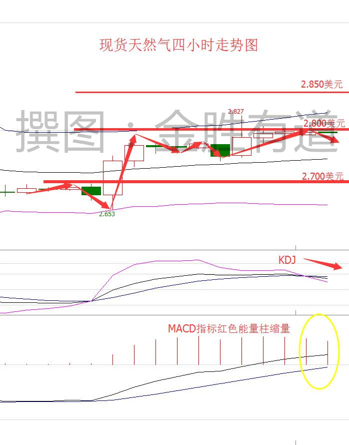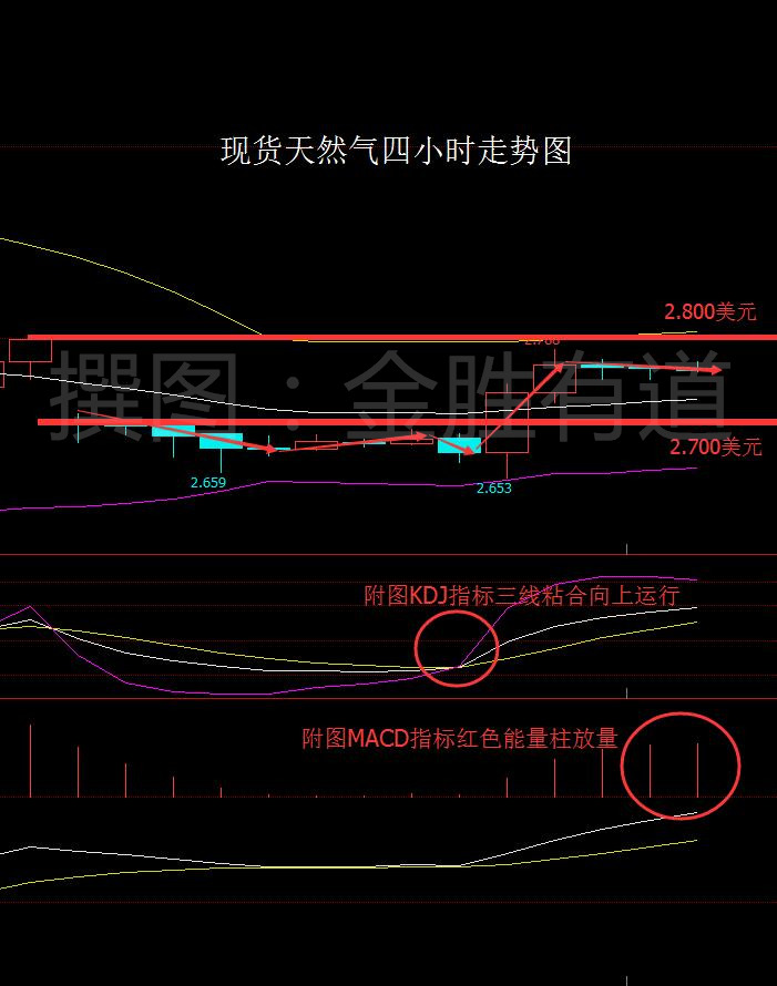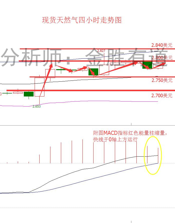 风可以吹起一张纸,却无法吹走蝴蝶,努力不是变相的证明,而是一种本能的坚持,自律不是框架下的约束,而是认识后的选择。人生是一次不断选择重叠的旅途,投资却是这次旅程中是精彩的瞬间,学会享受、懂得检索。 现货天然气 从四小时走势图来看,隔夜天然气价格震荡运行,目前交投于2.7美元下方,上方阻力位置关注2.750美元