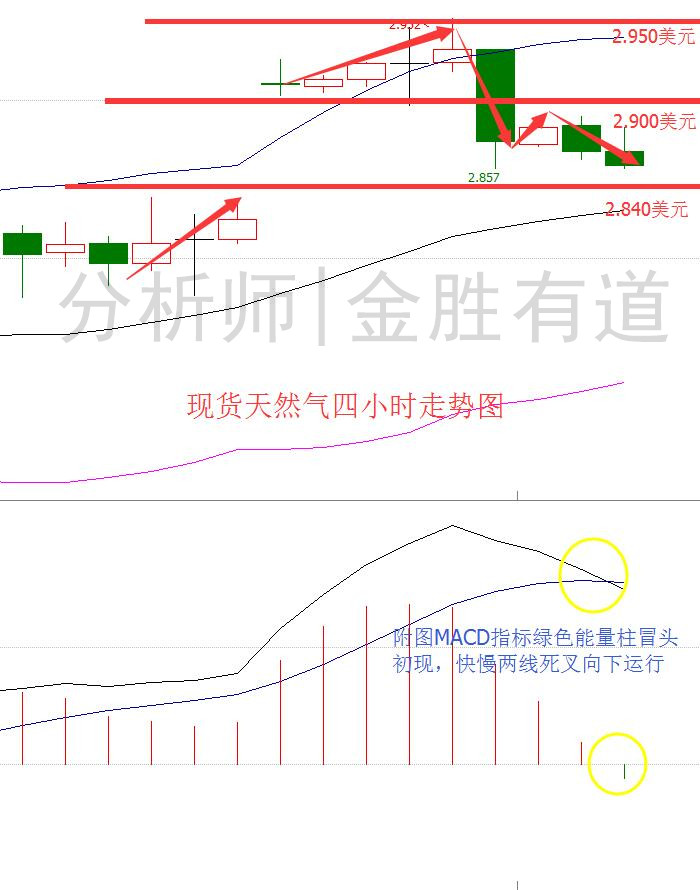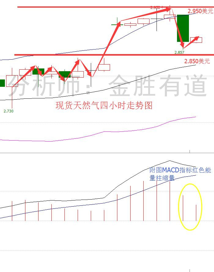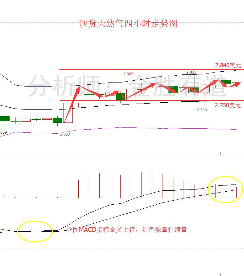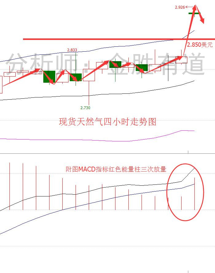 有时候,你恨自己单边不在,有时候,你恨自己逆势抄底,可是,每天都在干着这样让自己悔恨的事情,却在不知不觉中让资金跟着市场一起跳水,无数次你曾期盼翻倍的机遇能够光顾,可是,方向错误的奔跑难道真的可以到达预期的目标? 现货天然气 从四小时走势图来看,早间高开0.1美元,K线突破布林带上轨,短线支撑初步看向2.8