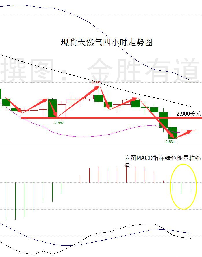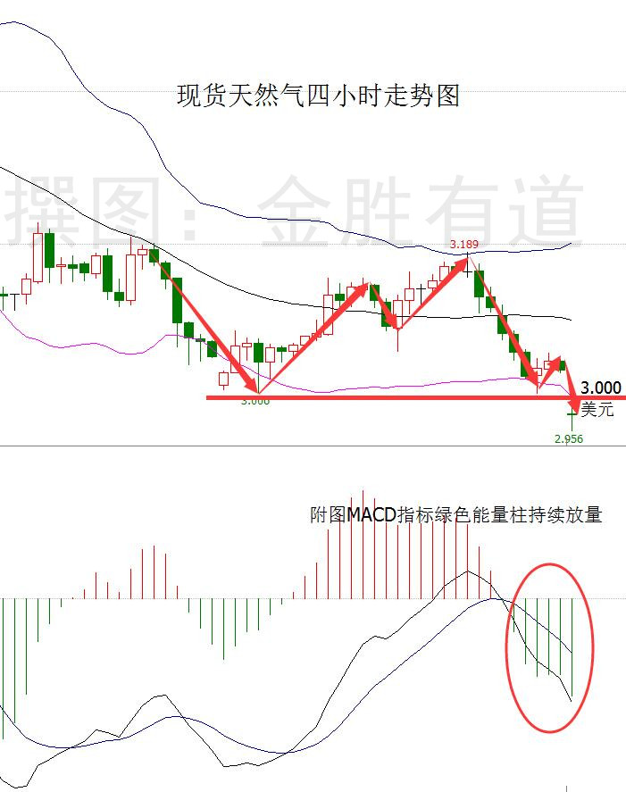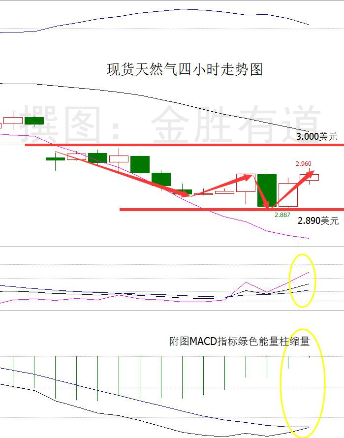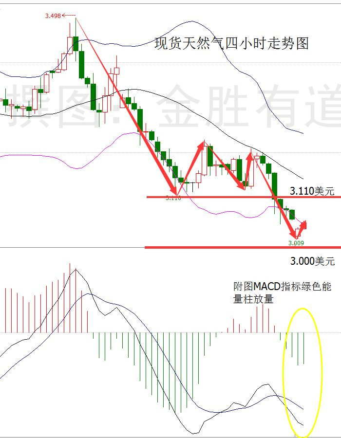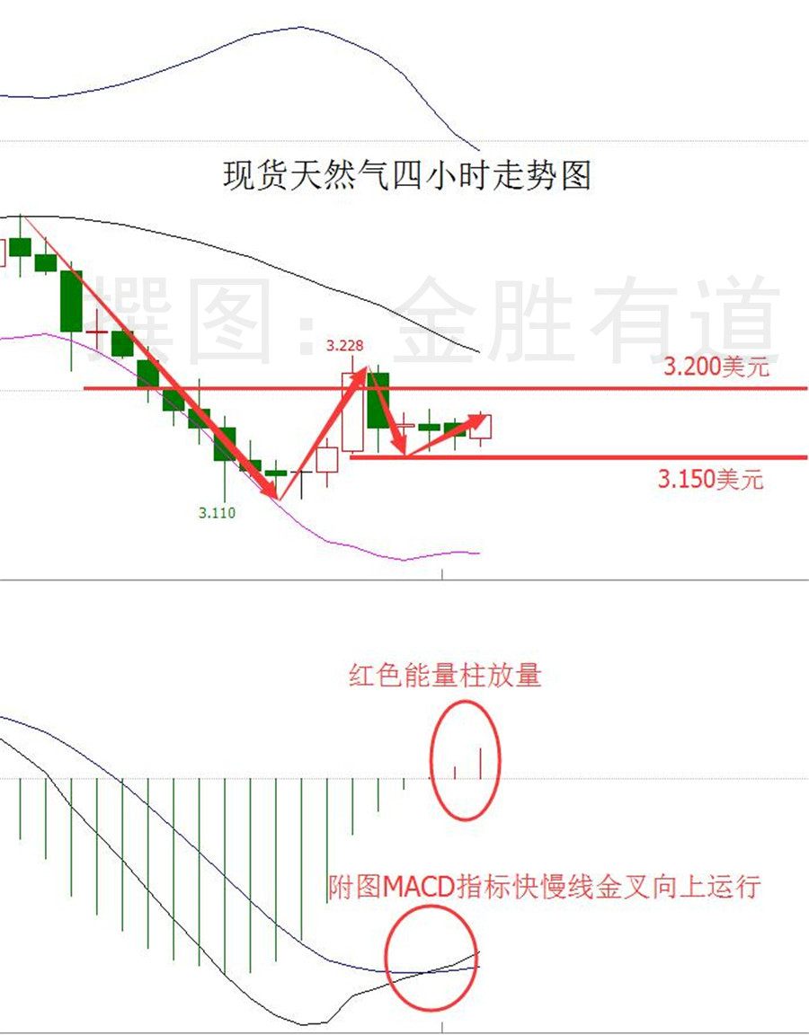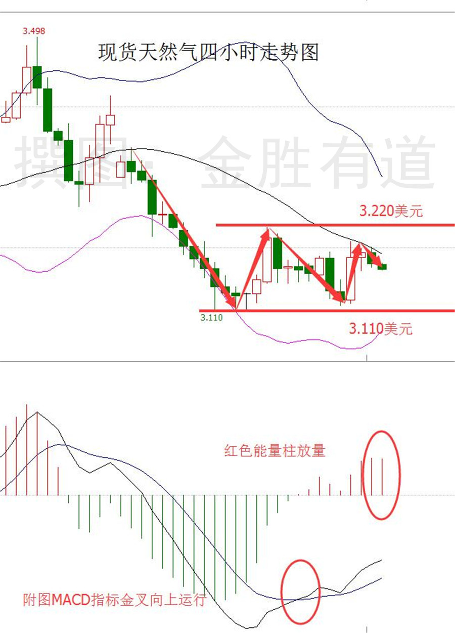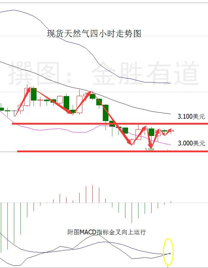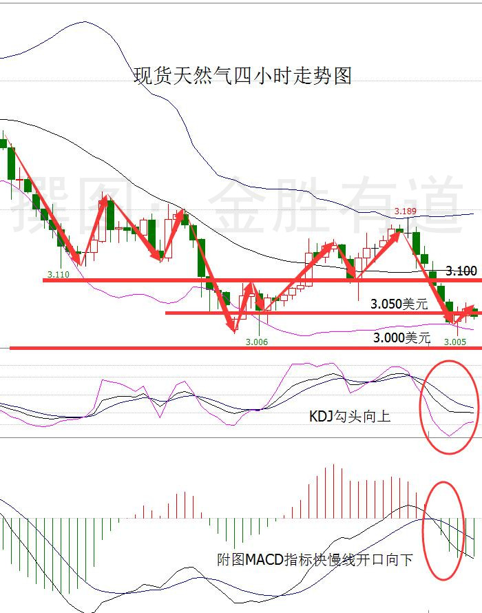 不要指望,麻雀会飞得很高。高处的天空,那是鹰的领地。麻雀如果摆正了自己的位置,它照样会过得很幸福! 现货天然气从四小时走势图来看,天然气两次下探3.000美元关口,都未能突破,目前价格仍震荡于3.000-3.100美元之间;从指标来看,K线运行于布林带下轨与中轨之间,附图MACD指标金叉向上运行;综合来看,天然气仍有反弹
