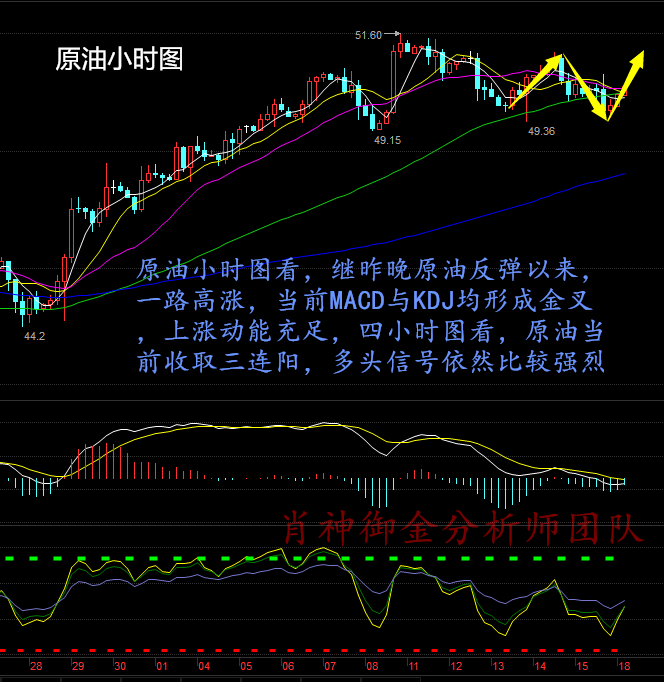 油价周三创15个月新高,美国EIA原油库存大降以及中国原油产量持续下滑均令油价得到支撑。此外多位石油界大佬发表了利好讲话,令下月明确限产方案的可能性上升,沙特能源部长法利赫称油市低迷的局面已接近尾声后油价大涨。 昨日早间API数据利多,本人布局多单进场,亚欧盘比东不大,晚间EIA数据公布之后,本人提示出局,51.