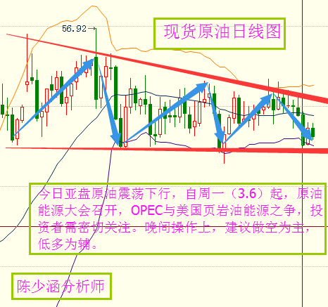 陈少涵:3.1晚间现货原油白银走势分析,EIA提前布局 消息面解读 周三(3月1日)亚市尾盘,国际原油价格一度下行,目前美原油在54美元下方运行,最新数据显示,美国API原油库存录得连续第八周增加,令油价遭受承压。尽管去年底石油输出国组织(OPEC)以及非OPEC产油国联合减产,帮助油价重新回到每桶50美元上方。但陈少涵预计,