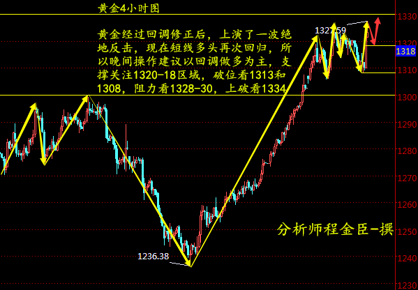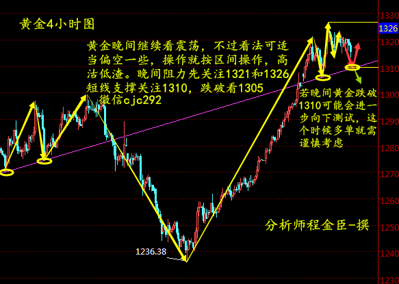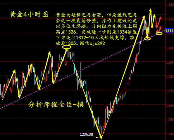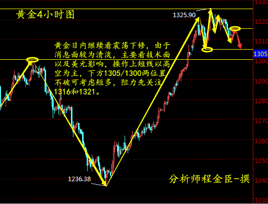 北京时间(1.10程金臣/撰)宝剑锋从磨砺出,梅花香自苦寒来,挺过了艰难的日子,迎接你的将会是你所向往的春天。本周前两天黄金延续走震荡修正,长时间的高位盘整对多头很不利,由于基本面利空显露,多头开始萎靡,短线空头在慢慢搬回优势,若继续回调跌破1305和1310这两个关键支撑的话,多头防线可能就此崩溃,紧接着就是空