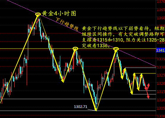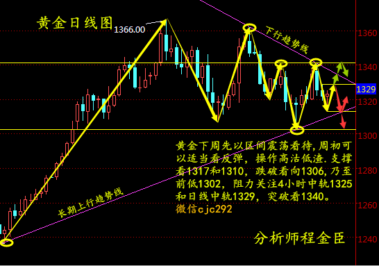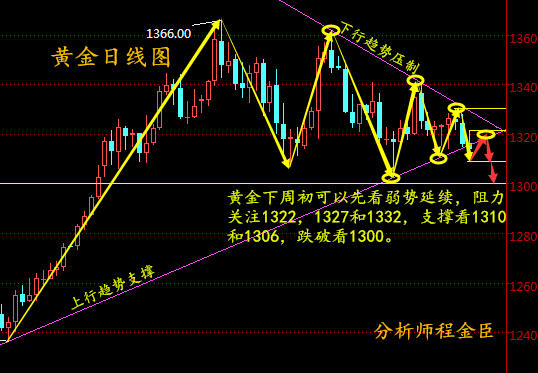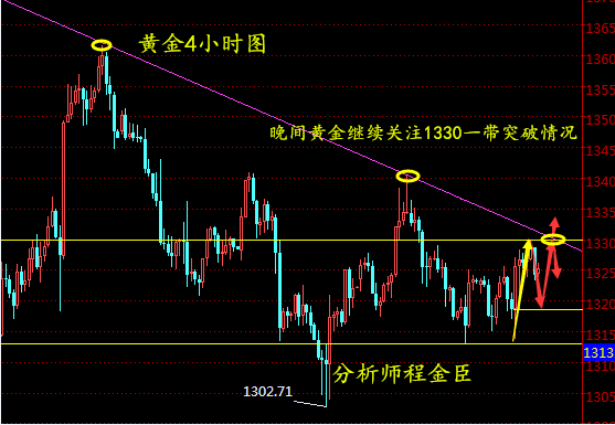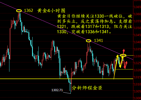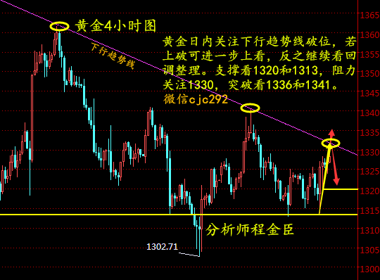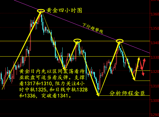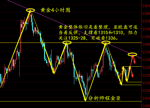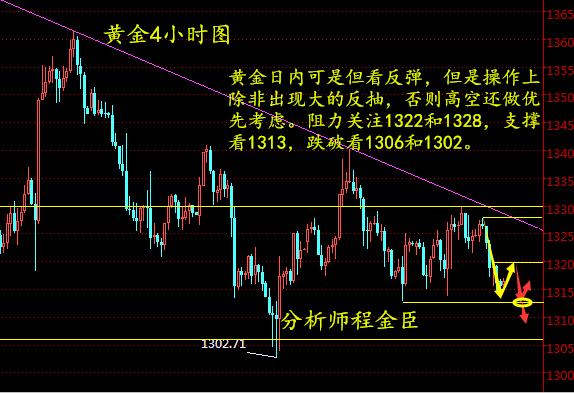 北京时间(3.16程金臣/撰)一直在说的震荡走势,你却偏要去一厢情愿的看好一方,只因为金价震荡上行后在关键阻力下方走整理,认为要突破,实际下行趋势1329压制并没那么容易突破,而此前基本面虽然有些利好助推,但影响也是有限。黄金昨日承压回撤,并且是四周最低收盘,你又作何感想?市场行情难测,多数交易者在亏损时不愿