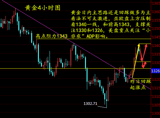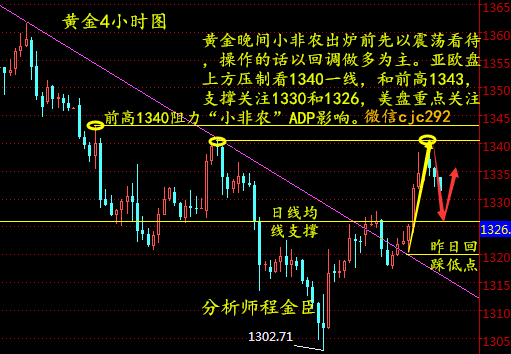 北京时间(3.7程金臣/撰)今日亚盘黄金预期先走回调,早盘跳空高开触及1340关口后承压,由于多头能量过渡的消耗,黄金回撤到目前是意犹未尽,欧盘继续关注回踩止跌。目前的黄金想要一举收复前期跌幅是不现实,尽管避险情绪有所升温,但是市场评论的贸易战并没有发生,所以影响也会有限。在非农到来前夕美元重拾跌势,黄金更
