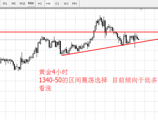 李兴淼:黄金区间调整缺乏方向倾向于看涨 就一个交易商品品种而言不会存在那么多的趋势机会给你,更多的时候都是处于震荡调整的路上,就好像最近的黄金波动一样在前期的趋势上涨后整体就维持在区间内震荡,这个时候是考虑你交易的耐心也是考验你对于行情趋势方向的判断把握了。 黄金目前应该还是处于1340-50的区间附近上下震