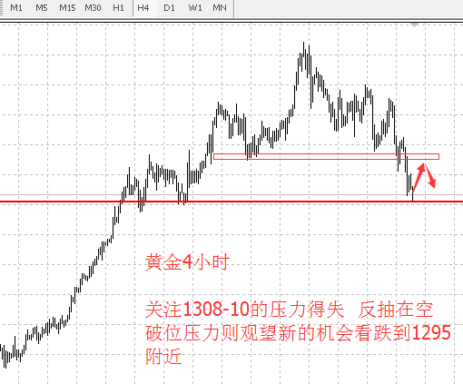 李兴淼:黄金暂不追空关注1308-10压力调整机会 交易有时候就是一个亡羊补牢的过程,错误并不可怕而可怕的是认识不到错误并且也不愿意去改正。黄金这一波掉头下跌我们思路一直正确昨日评论之中提出1333下择机做空测试高点也就是1332附近,并且认为下跌极限会测试到1305-10附近位置,今日已经是测试到1310附近位置了。 黄金这